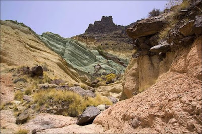 GRAN CANARIA - Gran Canaria o szerokości 60 km to kolista wyspa pośrodku archipelagu Kanarów. Została zmodyfikowana przez zapadnięcie się kaldery i ekstensywną erozję. Północna i wschodnia część masywnego wulkanu tarczowego obfituje w stożki scorii i wylewy lawy. Roque Nublo Formation to formacja wulkaniczna obejmująca wylewy lawy i materiały piroklastyczne na Gran Canaria wyprodukowane przez strato-stożek w centrum wyspy o przypuszczalnej wysokości do 2500 metrów. Ostatnia erupcja na Gran Canaria miała miejsce w roku 40 plus minus 75 lat. Na zdjęciu maar Marteles na Gran Canaria, krater Bandama, kaldera De los Pinos de Gáldar oraz stare wylewy lawy kontrastujące z błękitem oceanu.